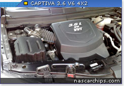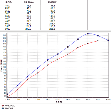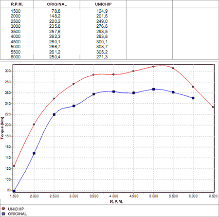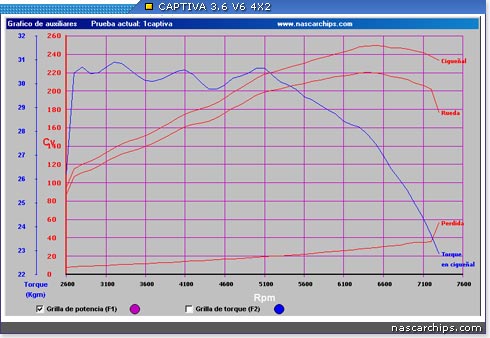 Gráfico de torque (em azul) e potência na roda e no motor (vermelho) de uma Captiva original (220cv na roda / 250 cv no motor):